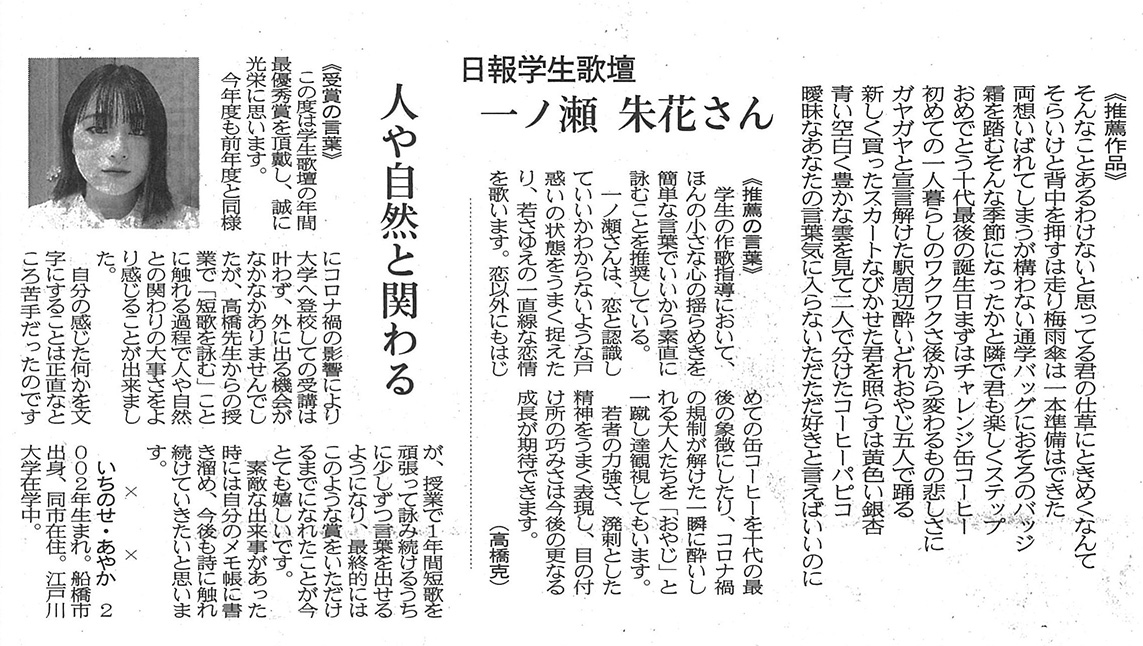社会学部人間心理学科2年の一ノ瀬朱花さんが千葉日報社の「2021年読者文芸年間最優秀賞『日報学生歌壇』」を受賞しました。